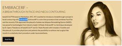 • The home page also highlights bodySCULPT®’s specialized procedures such as minimally invasive Brazilian butt lift and EmbraceRF.